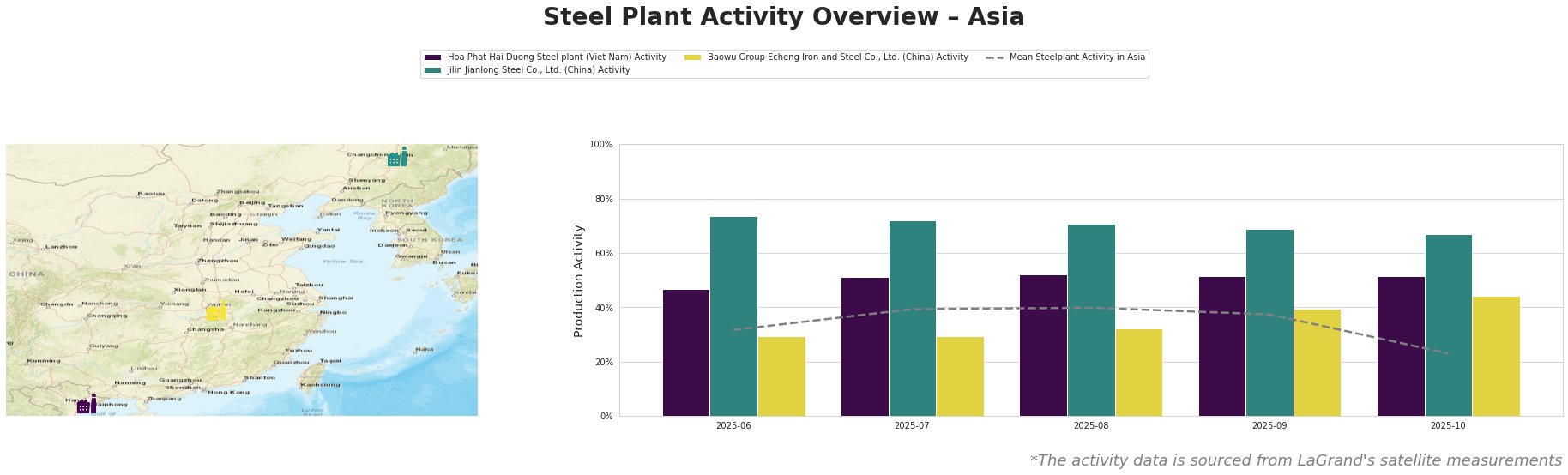 Hoa Phat Hai Duong Steel plant, a Vietnamese integrated steel producer with a 2.5 million tonne BOF capacity, has maintained stable activity around 51-52% from July to October. This stability occurs even as overall Asian activity declines, per the satellite data. No direct connection between this stable activity and the news articles can be established.