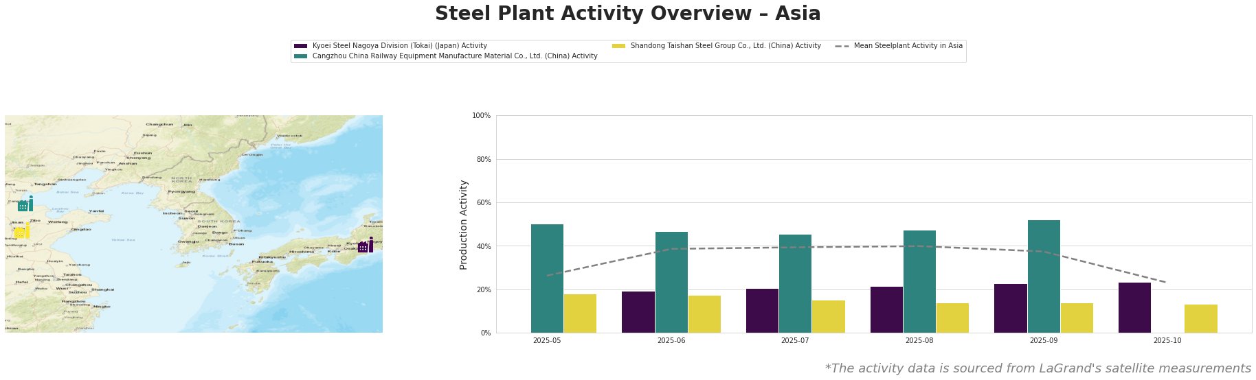 Bar chart and satellite map of steel production activity in Asia