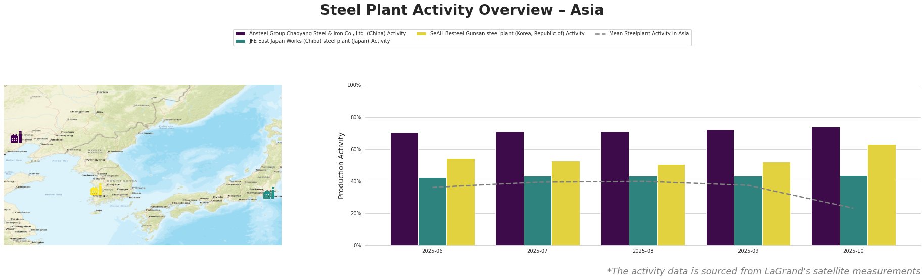 The mean steel plant activity in Asia fluctuated, with a significant drop to 23% in October 2025. Ansteel Group Chaoyang Steel & Iron Co., Ltd. showed a consistent upward trend, reaching 74% activity in October, significantly above the Asian average. JFE East Japan Works (Chiba) steel plant showed relatively stable activity, ranging between 42% and 44%. SeAH Besteel Gunsan steel plant saw moderate fluctuations, peaking at 63% in October, also above the mean activity level for the region.