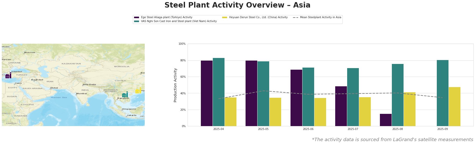 The mean steel plant activity in Asia fluctuated, peaking at 43% in May and declining to 35% in September. Ege Steel Aliaga plant, a Turkish EAF-based producer of 2,000 ttpa crude steel capacity focused on rebar and wire rod, experienced a sharp decline in activity from 80% in April and May to 0% in September. This drastic reduction suggests a potential significant disruption in their production, but no direct link to the provided news articles can be established. VAS Nghi Son Cast Iron and Steel plant in Vietnam, with a 3,150 ttpa EAF-based capacity producing billet, rebar, and wire rod, maintained relatively high activity levels, ranging from 71% to 83%, indicating stable production. Heyuan Derun Steel Co., Ltd. in China, an EAF-based producer with 1,200 ttpa capacity focused on hot rolled rebar and billet, showed a gradual increase in activity from 35% in April/May to 48% in September. This increase potentially reflects the surge in Chinese steel exports mentioned in “IREPAS Meeting: 2025 set to be record year for China’s steel exports,” although no direct causal link can be conclusively proven.