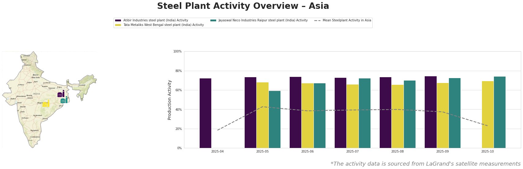 Tata Metaliks West Bengal steel plant, a ResponsibleSteel certified integrated (BF) plant in West Bengal, India, with a crude steel capacity of 255 ttpa, showed stable activity between May and October 2025 (66%-70%). As with Atibir Industries, the plant’s stable activity appears independent of the Chinese market fluctuations reported in the provided news articles.