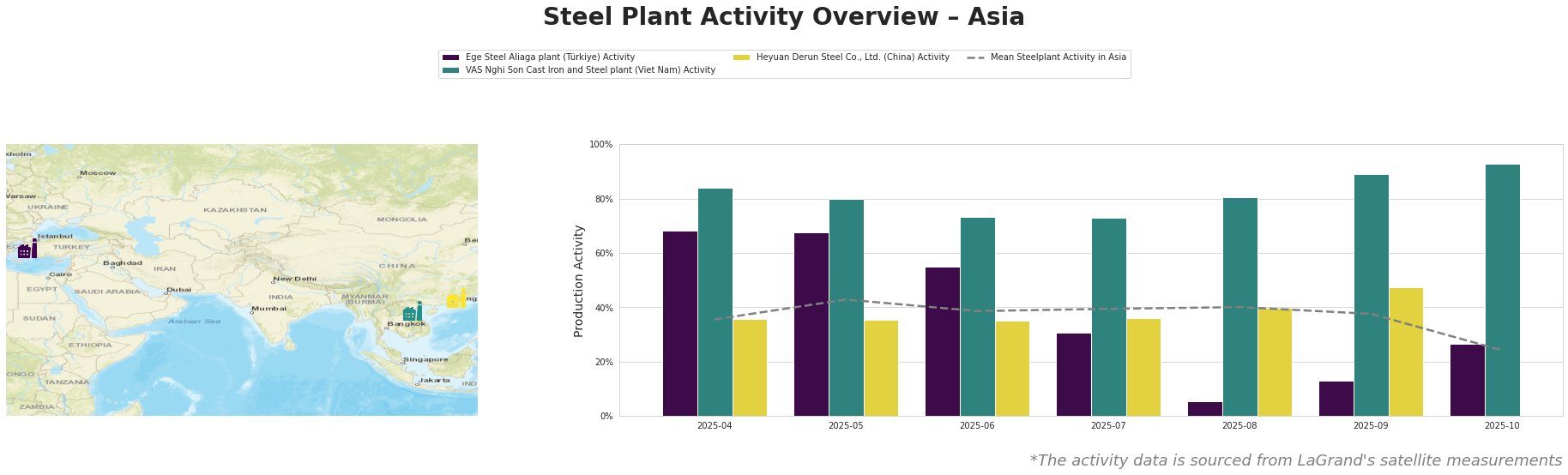 Ege Steel Aliaga plant, an EAF-based mill in Turkey with a 2 million tonne crude steel capacity producing rebar and wire rod, experienced a significant activity drop to 5% in August, then slightly recovering to 27% in October. This decline, given the plant’s reliance on electric arc furnaces, could be related to the raw material concerns (scrap availability, rising freight costs for Turkish suppliers) cited in “Raw Material Suppliers at IREPAS: Global trade conditions are “devastating” due to uncertainty“.