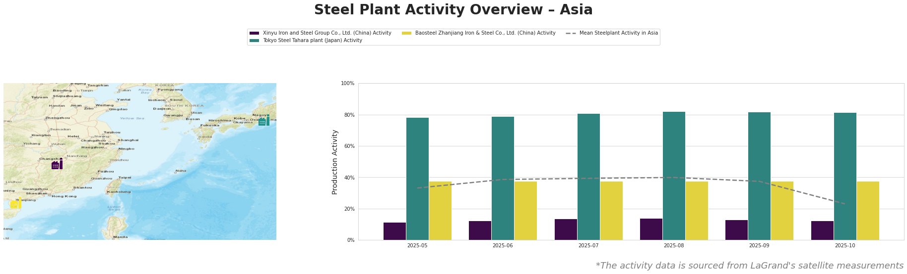 The mean steel plant activity in Asia initially rose from 33% in May to a peak of 40% in August before declining to 23% in October, representing a significant decrease. Xinyu Iron and Steel Group Co., Ltd. consistently operated at low levels (11-14%), substantially below the Asian average. Tokyo Steel Tahara plant maintained a high activity level of around 80% throughout the observed period, consistently exceeding the average. Baosteel Zhanjiang Iron & Steel Co., Ltd. operated at a stable 38% activity level throughout the period.