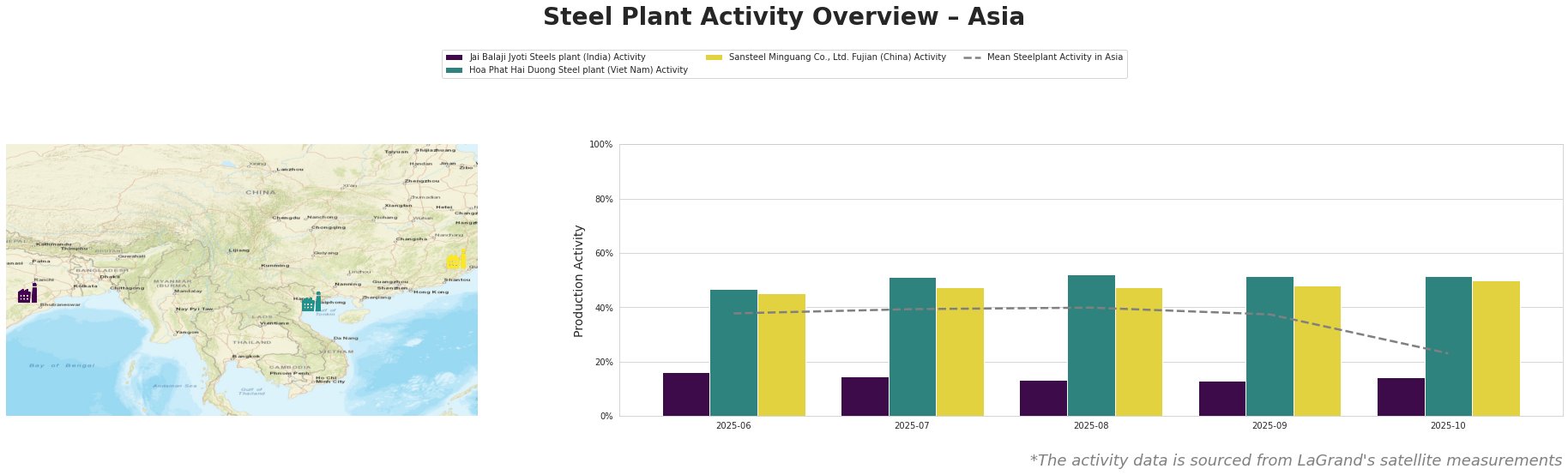 Bar chart and satellite map of steel production activity in Asia