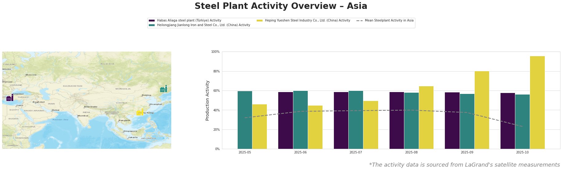 The mean steel plant activity in Asia decreased sharply in October 2025 to 23.0%, a significant drop from 37.0% in September and a high of 40.0% in August. Habas Aliaga steel plant (Türkiye) activity remained relatively stable at around 59%, slightly below the Asian average in the recent months. Heilongjiang Jianlong Iron and Steel Co., Ltd. (China) activity also remained relatively stable over the observed months but saw a slight drop to 56.0% in October. Heping Yueshen Steel Industry Co., Ltd. (China) activity sharply increased to 96.0% in October.