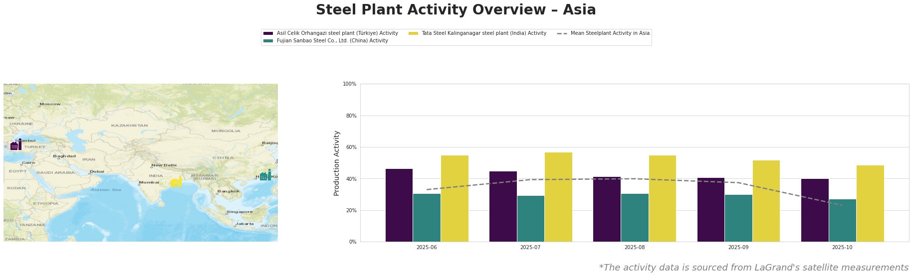 Asil Celik Orhangazi steel plant (Türkiye), an EAF-based plant producing 550 ttpa of crude steel with a focus on automotive and energy sectors, showed a moderate decline in activity from 46% in June to 40% in October. While the plant’s end-user sectors include automotive, aligning with the themes of “Why the US auto industry is bracing for an EV winter” and “Auto Industry Faces ‘EV Winter’ Amid Policy Shifts and Supply Chain Woes“, the magnitude of the decrease doesn’t suggest an overwhelming impact. A more precise correlation cannot be established based on the available data.