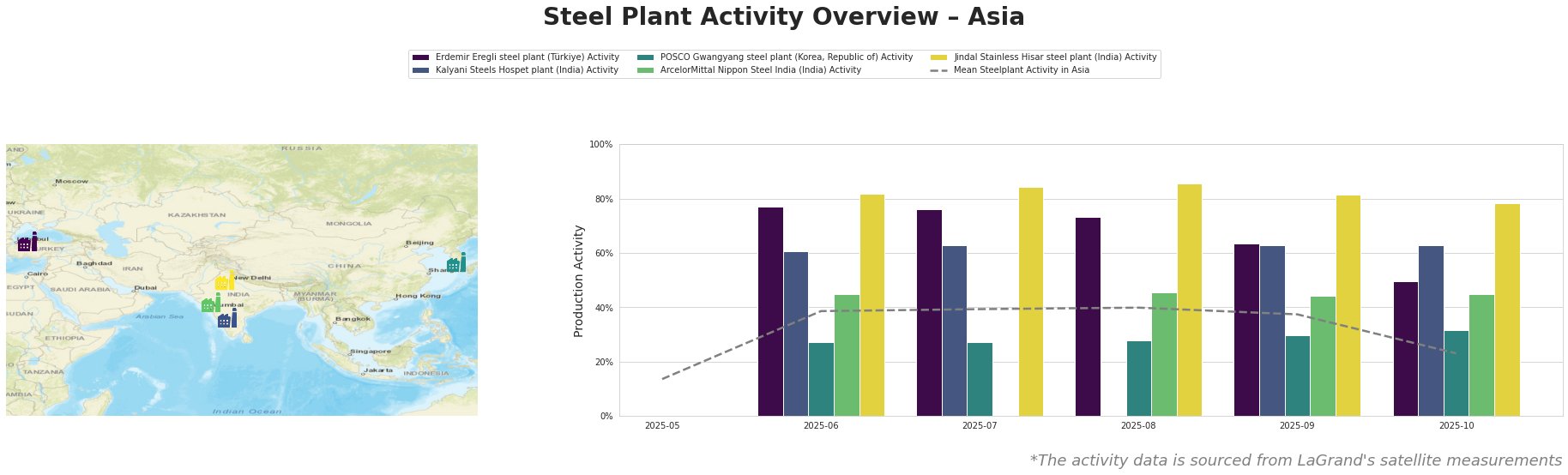 ArcelorMittal Nippon Steel India, an integrated BF/DRI/EAF steel plant in India, also displayed stable activity levels in the range of 44% and 46% between June and October. The plant has a crude steel capacity of 9.6 million tons, producing hot-rolled, cold-rolled, and galvanized products. Its markets span automotive to infrastructure. No direct connection to any named news articles is found.