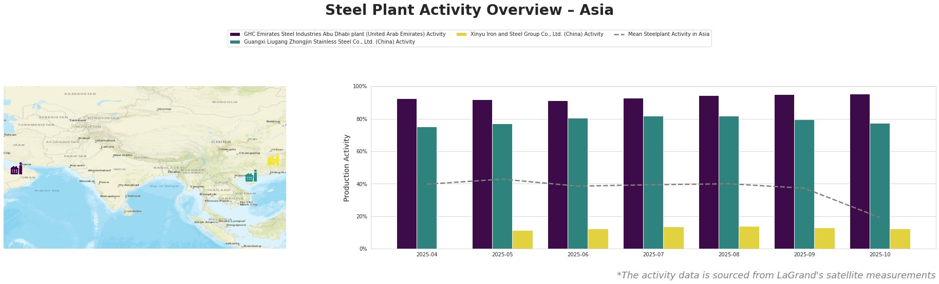 GHC Emirates Steel Industries Abu Dhabi plant, a DRI-based EAF steelmaker with a 3.5 million tonne crude steel capacity, primarily produces semi-finished and finished rolled products for the automotive, building, energy, and transport sectors. The plant’s activity remained consistently high throughout the observed period, peaking at 95.0 in September and October 2025. While the overall Asian mean activity dropped significantly, the GHC Emirates plant has remained stable. No direct correlation to the named news articles can be established based on this observation.