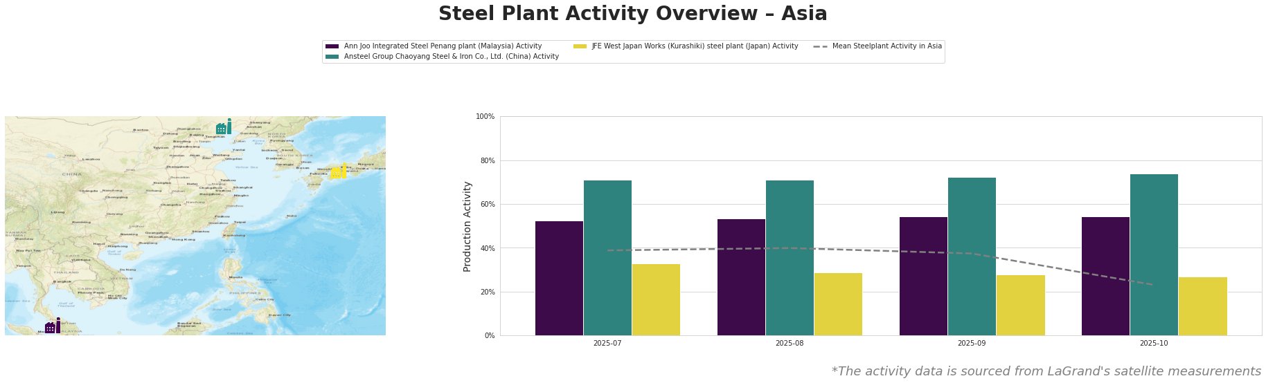The mean activity for steel plants in Asia shows a notable drop from 39% in July to 23% by October 2025. The Ansteel Group Chaoyang Steel plant experienced a peak activity of 74% in October, in line with higher emissions noted in “Emissions in China’s steel industry increased by 7.1% y/y in November.” Conversely, JFE West Japan Works shows a decline from 33% to 27%, illustrating challenges amid changing dynamics, though specific links to regional news are less prominent.