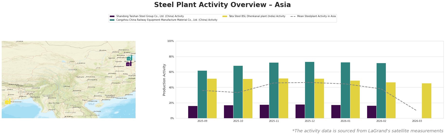 Bar chart and satellite map of steel production activity in Asia