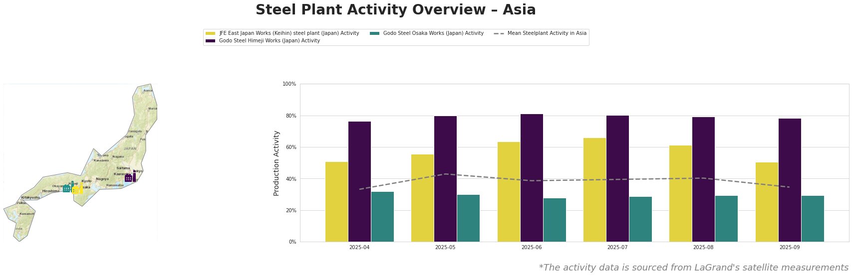 Godo Steel Himeji Works, an EAF-based plant with a crude steel capacity of 805 ttpa, maintained a high activity level, fluctuating between 76% and 81%. The plant holds ISO14001 (2020) and Responsible Steel certifications. The observed high activity level contrasts the overall market trend. No direct link between its activity and the provided news could be identified.