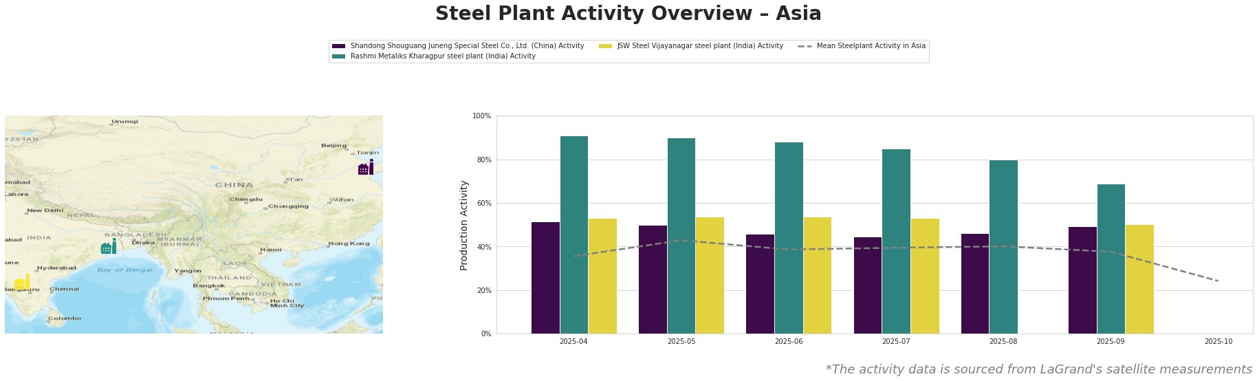 The mean steel plant activity in Asia shows a significant drop to 24% in October after hovering between 36% and 43% for the preceding months. This substantial decrease in October warrants close monitoring.