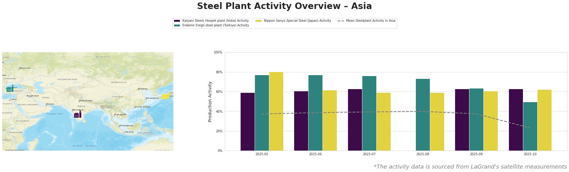 Kalyani Steels Hospet plant, an integrated steel producer (BF and DRI) with a crude steel capacity of 860 ttpa, primarily serves the automotive, building, and energy sectors with rolled bars and rounds. Despite the regional downturn, Kalyani Steels maintained a consistent activity level of 63% between July and October, indicating robust demand and potentially reliable supply from this plant. There is no observable connection between Kalyani Steels’ activity and the news articles concerning US-China trade negotiations.