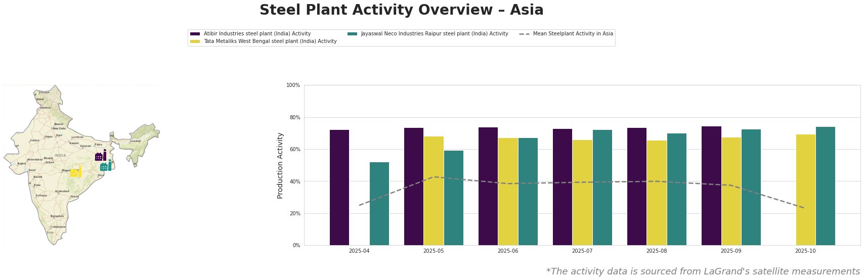 The mean steel plant activity in Asia has seen a significant drop to 23% in October, a substantial decrease from the 40% observed in August. Atibir Industries steel plant showed relatively stable activity between April and September, consistently exceeding the Asian mean, but with no data for October. Tata Metaliks West Bengal steel plant exhibited stable activity between May and September, before an increase in observed activity in October to 70%. Jayaswal Neco Industries Raipur steel plant showed steady activity between May and October, and was at its peak in October at 74%. It is worth mentioning that the crude steel output decrease mentioned in the article “China’s crude steel output totals 73.49 million mt in Sept, down 2.9% in Jan-Sept 2025” cannot be directly linked to observed plant activity levels, because only Indian steel plant activity levels are available in the provided dataset.