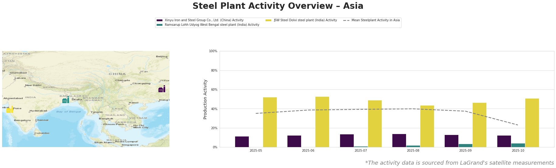 The mean steel plant activity in Asia fluctuated between 35% and 40% from May to August, before dropping significantly to 23% in October. Xinyu Iron and Steel Group Co., Ltd. in China, an integrated BF steel plant with a 10,000 ttpa crude steel capacity, showed relatively stable activity around 11-14% throughout the period. Ramsarup Lohh Udyog West Bengal steel plant in India, producing semi-finished and finished rolled products using integrated BF and DRI processes, demonstrated very low activity, increasing slightly from 0% in May-June to 4% in October. JSW Steel Dolvi steel plant in India, with a 5,000 ttpa crude steel capacity utilizing integrated BF and DRI processes alongside EAF technology, exhibited the highest activity levels among the observed plants, ranging from 44% to 53%. Its activity decreased from June to August before increasing again in September and October. The October drop in mean activity is significantly influenced by Xinyu Iron and Steel Group Co., Ltd. and Ramsarup Lohh Udyog West Bengal steel plant. No explicit connection can be made between the observed activity patterns and the news articles provided, though the article “Indonesia, Malaysia set new emissions reduction targets” may lead to longer-term shifts in plant activity as emissions targets are pursued.