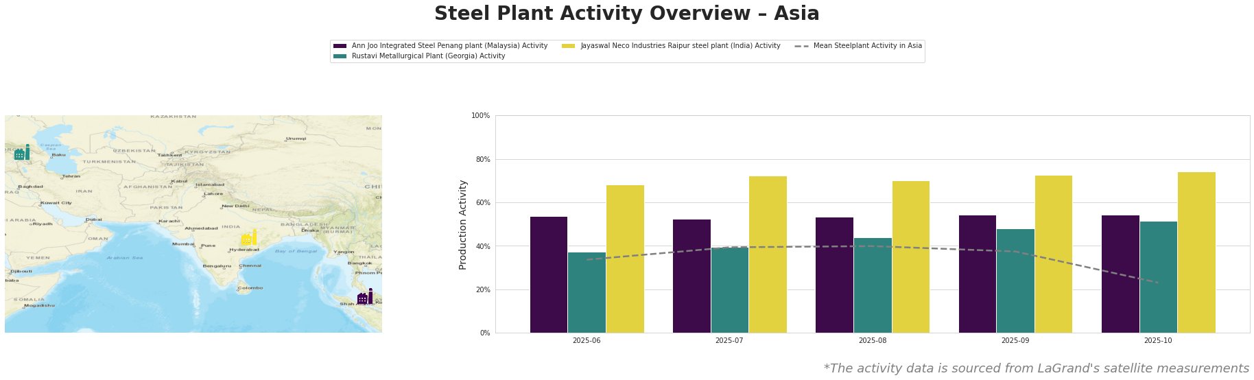 The Ann Joo Integrated Steel Penang plant in Malaysia, with a crude steel capacity of 500 thousand tonnes per annum (ttpa) produced via electric arc furnaces (EAF) utilizing an integrated blast furnace (BF) process, has maintained stable activity levels around 54% between June and October 2025. This sustained activity, consistently above the Asian average, suggests resilience despite the broader regional downturn and reduced imports in India. The stable output could provide a reliable source of semi-finished products like pig iron and billets for building and infrastructure projects. No direct connection can be established between the news articles and satellite-observed activity, as the plant maintains high levels compared to the average across the observed time period.