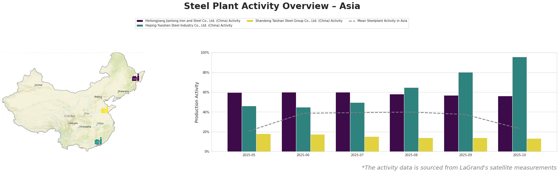 The mean steel plant activity in Asia fluctuated, ranging from a low of 21% in May 2025 to a high of 40% in August 2025, before dropping significantly to 23% in October 2025. Heilongjiang Jianlong Iron and Steel Co., Ltd. maintained relatively stable activity levels around 60% throughout the observed period, experiencing only a slight decrease to 56% by October. Heping Yueshen Steel Industry Co., Ltd. showed a significant increase in activity, rising from 46% in May to 96% in October. Shandong Taishan Steel Group Co., Ltd. displayed a consistently low activity level, fluctuating between 13% and 18% over the same period.