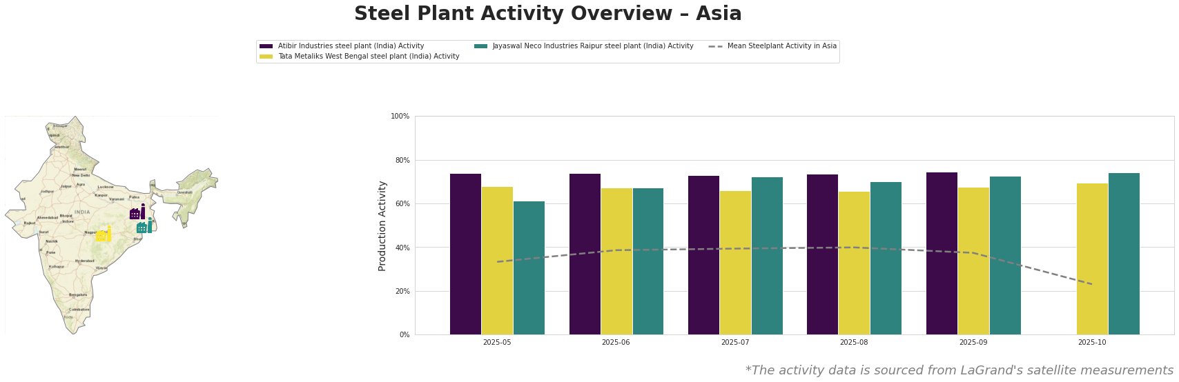 Atibir Industries, located in Jharkhand, India, operates with an integrated BF-BOF process and a crude steel capacity of 600 ttpa. Although the plant activity could not be measured in October, satellite data indicated relative stability in plant activity from May to September (73-75%). No direct connection to any of the provided news articles can be established based on the available data.