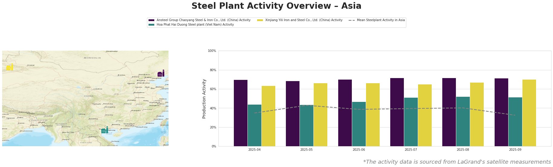 Xinjiang Yili Iron and Steel Co., Ltd., located in Xinjiang, China, has a smaller crude steel capacity of 1 mtpa, relying on BF-BOF technology. It specializes in hot-rolled round bars and wire rods. The plant’s activity levels remained relatively stable, increasing steadily from 63% in April to 70% in September. While the EU tariff news (“The EU may impose tariffs of 25-50% on Chinese steel – Handelsblatt”) could indirectly influence this plant, given its location and product focus, no direct connection can be confirmed.