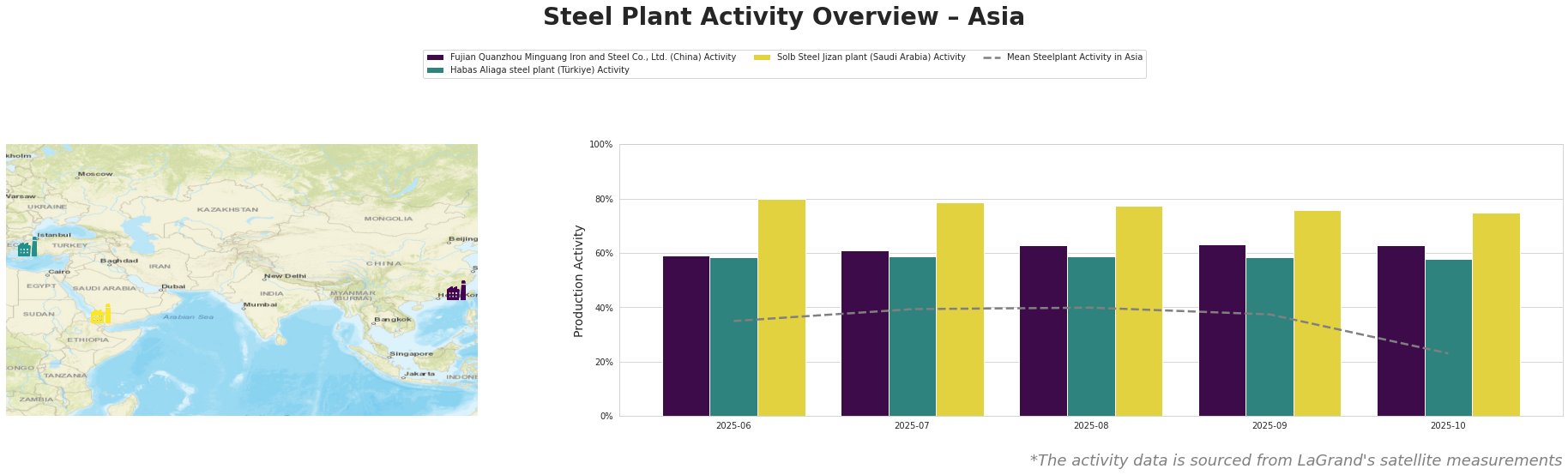 The mean steel plant activity in Asia experienced a notable drop in October 2025 to 23.0%, contrasting with the stable activity levels observed at individual plants like Fujian Quanzhou Minguang.