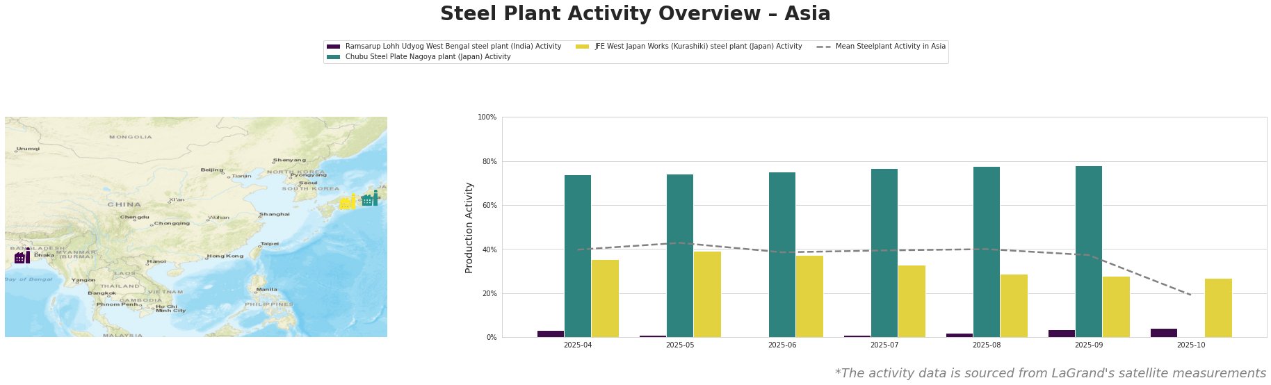 Chubu Steel Plate Nagoya plant, a 700 TPTA EAF steel plant producing plates for automotive, building & infrastructure, tools & machinery, and transport, has consistently operated at high activity levels between April and September, between 74% and 78%. The high activity aligns with the increased demand for steel in infrastructure and automotive sectors, but there is no direct supporting news available in the provided corpus. No data is available for October.