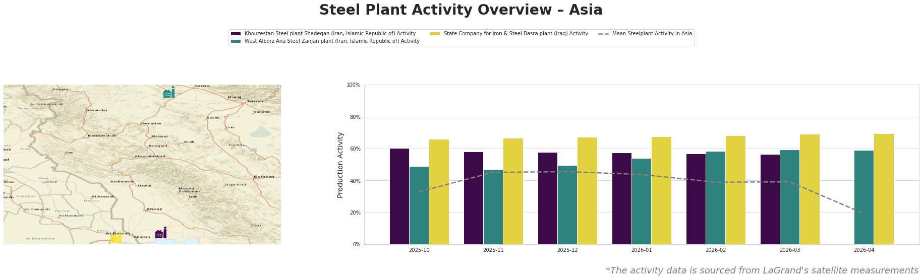 The Khouzestan Steel plant Shadegan registered a notable drop from 56% in March to an unmeasured activity level in April, attributable to extensive damage from military actions detailed in “Iran steel supply unlikely to benefit from ceasefire.” Comparatively, the West Alborz Ana Steel Zanjan plant sustained stable operations at 59% but remains impacted by overall geopolitical risks without any significant gain from the ceasefire. State Company for Iron & Steel Basra showed the only increase to 70% activity but lacks direct ties to the ongoing Iranian conflicts, indicating a distinct operational dynamic unaffected by Iran’s issues.