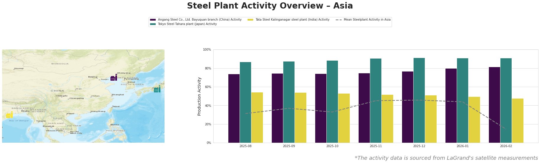 The Angang Steel Co., Ltd. Bayuquan branch in China has shown strong stability with an activity level of 81.0% in February 2026, a notable increase from 74.0% observed in August 2025, aligning with overall demand reflections in A O Smith’s earnings report. However, some fluctuations persist, as this plant’s activity peaked at 80% in January before stabilizing.
