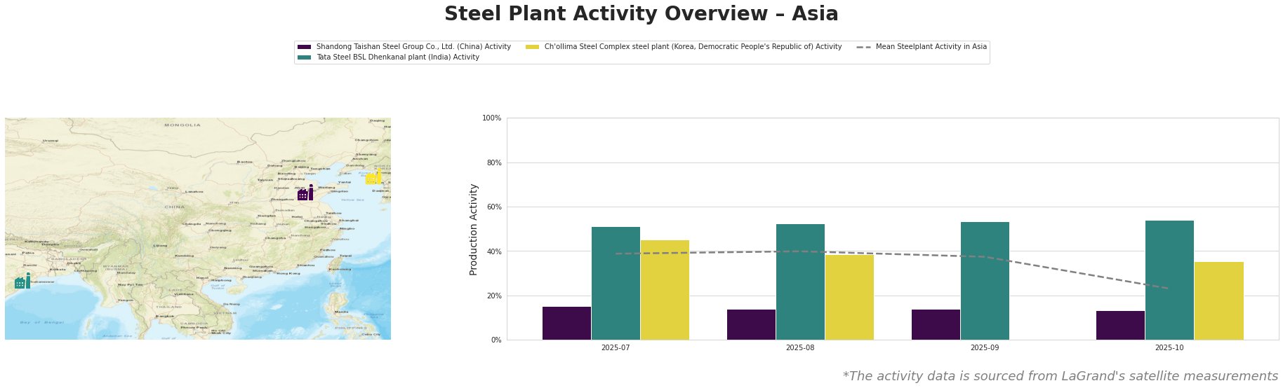 The Tata Steel BSL Dhenkanal plant in Odisha reflects a robust operational trend, with activity soaring to 54% in October, aligned with increased domestic production aimed at export markets as noted in India increased steel exports by 31% y/y in April-November. Conversely, the Shandong Taishan Steel Group reflects declining trends, stabilizing at a low point of 13% activity as local oversupply pressures mount without any direct correlation to the named news articles. The Ch’ollima Steel Complex observed reduced data availability; thus, direct implications remain ambiguous.