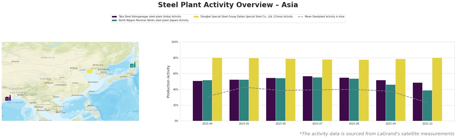 The mean steel plant activity in Asia peaked in May at 43% and experienced a significant drop in October to 23%. The Dongbei Special Steel Group Dalian Special Steel Co., Ltd. in China consistently operated at high activity levels (78-80%), significantly exceeding the Asian average. Tata Steel Kalinganagar in India showed moderate activity, ranging from 49% to 57%. North Nippon Muroran Works in Japan experienced the most pronounced decline, falling from 55% in July to 39% in October. No direct link between the trade news and specific plant activity changes could be established.