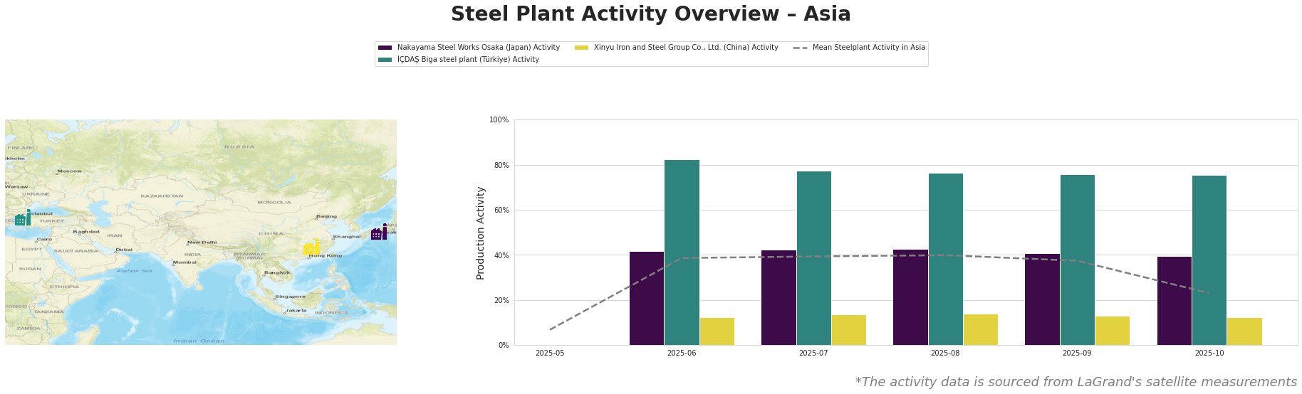 The mean steel plant activity in Asia peaked at 40% in August 2025 and has since declined to 23% by October 2025. The most significant activity was observed at the İÇDAŞ Biga steel plant, while activity at Xinyu Iron and Steel Group remained relatively low.