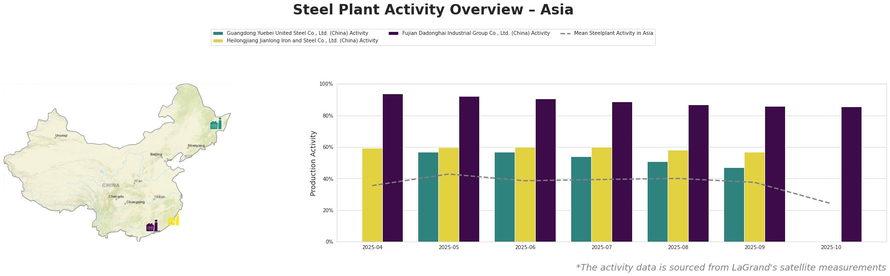 The mean steel plant activity in Asia began at 36% in April 2025, peaked at 43% in May, and then generally declined to 24% by October. Guangdong Yuebei United Steel Co., Ltd. showed a consistent decline from 57% in May to 47% in September. Heilongjiang Jianlong Iron and Steel Co., Ltd. exhibited relatively stable activity, hovering around 60% until a slight decrease to 57% in September. Fujian Dadonghai Industrial Group Co., Ltd. maintained the highest activity levels among the observed plants, starting at 94% in April and gradually decreasing to 86% by September and remaining there in October. The general downward trend in mean activity from May to October, culminating in a sharp drop in October, is notable.
