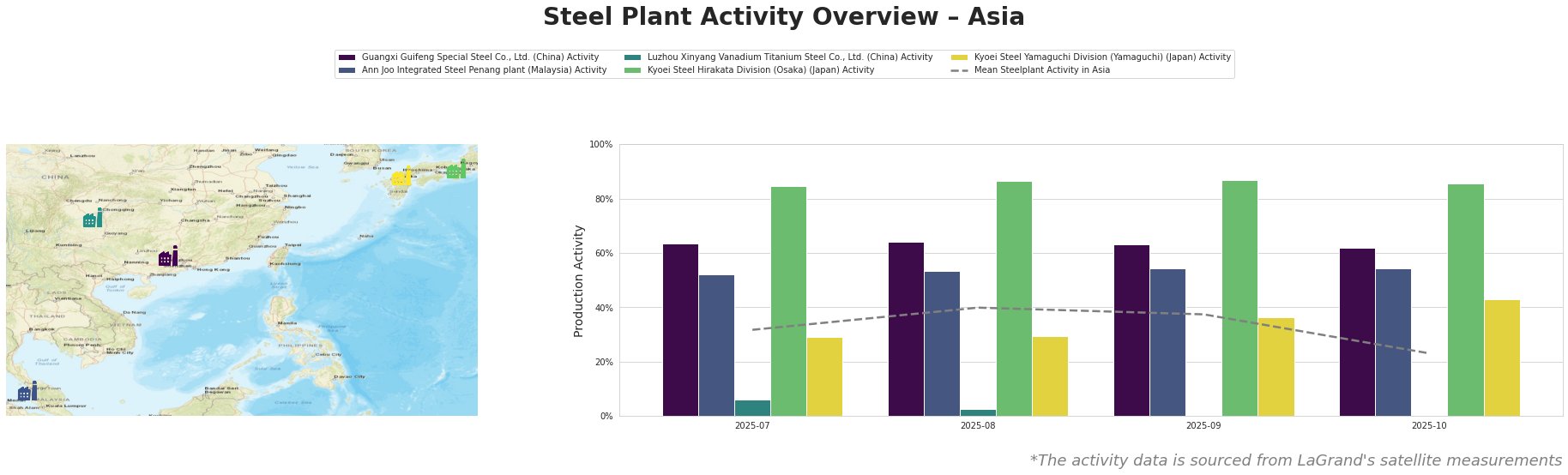 The observations indicate a steep drop in mean activity from 40.0% in August to 23.0% in October 2025, marked by particularly low levels (0%) at both Luzhou Xinyang Vanadium Titanium Steel Co. and across several Kyoei Steel divisions. This decline aligns with developments such as the US claims capture of Maduro after Venezuela strikes, suggesting wider implications for global market stability—potentially affecting steel availability and pricing.