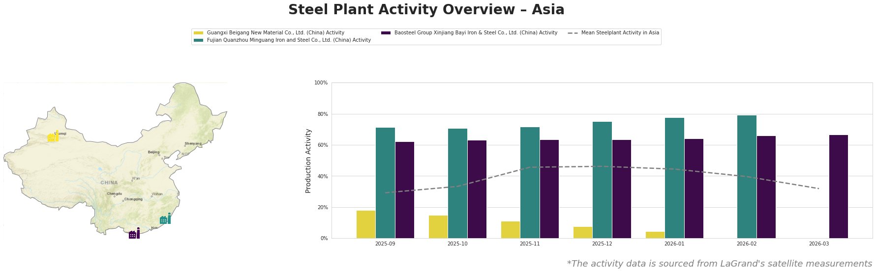 In a broader context, Guangxi Beigang New Material Co., Ltd. has displayed a dramatic decline in activity to 0% by February 2026 from 18% in September 2025, suggesting possible production halts or inefficiencies, though no direct connection to inventory levels can be verified. Fujian Quanzhou Minguang Iron and Steel Co., Ltd. showed steady outputs peaking at 79% in late February 2026, possibly reflecting ongoing market demand despite inventories. Baosteel Group’s activity remained relatively stable, decreasing only slightly to 66%, which may correlate with regional supply chain adjustments rather than market demand shifts.