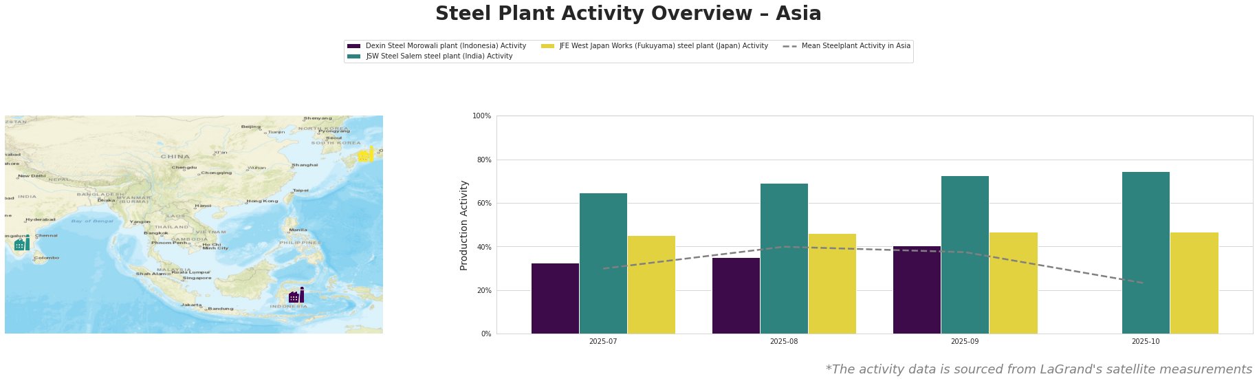 The JFE West Japan Works (Fukuyama) plant maintained relatively stable activity, hovering near 47%, suggesting a robust operational environment but not exempt from broader market impacts, inferred from general regional trends without a direct correlation to the cited news articles.