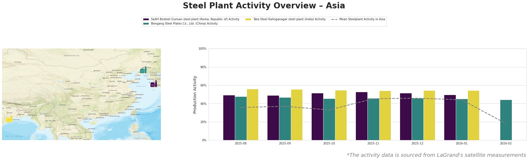 The Asian steel market shows a very positive outlook as significant changes unfold, particularly due to the “EU and India have agreed on a historic trade deal”. The newly finalized Free Trade Agreement (FTA) not only eases tariffs, allowing European automakers and steel exports increased access to India but also is expected to boost activity levels at steel plants. Observations reveal that the Tata Steel Kalinganagar plant maintained a robust 54% activity level, while SeAH Besteel Gunsan and Bengang Steel saw varied engagement but remained generally steady amidst this evolving landscape.