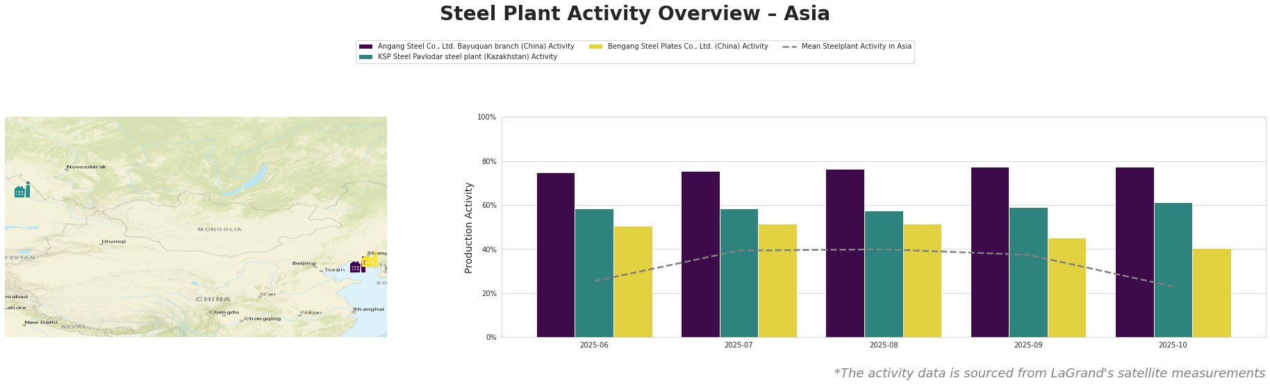 The data indicates a notable decline in mean steel plant activity, dropping to 23% in October from 40% in August. Particularly, Angang Steel Co. maintained relatively stable activity at around 77%, but this is in stark contrast to the 23% mean across all observed plants, with KSP Steel showing fluctuations between 58% and 61%. Notable declines in Bengang’s activity to 40% in October indicate heightened vulnerability.
