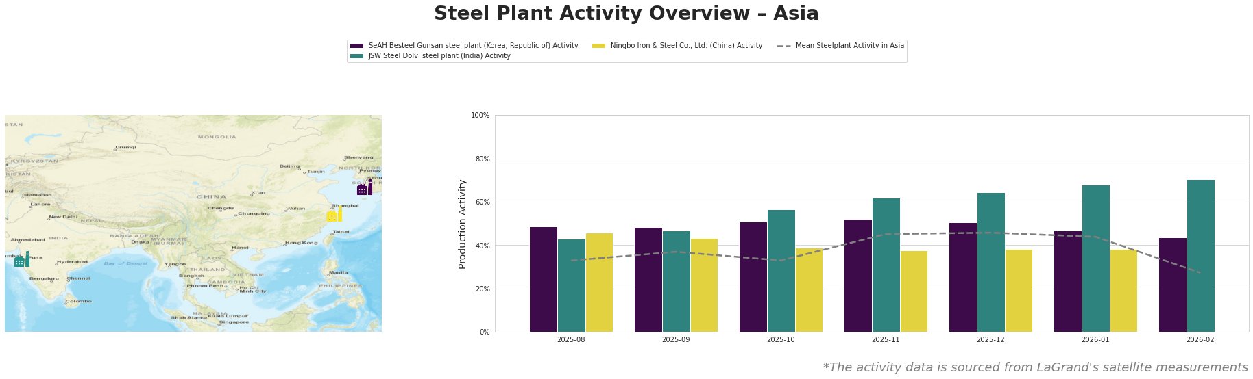 The JSW Steel Dolvi plant in Maharashtra shows remarkable growth, with activity rising from 62.0% in November 2025 to 70.0% by February 2026, corresponding with the positive sentiment surrounding engineering and automotive sectors influenced by the FTA, which is expected to boost domestic steel demand. In contrast, SeAH Besteel experienced a peak of 52.0% in November but dropped to 44.0% by February 2026. This decline may align with the uncertainty highlighted in “EU deal holds limited benefits for Indian steel market”, where carbon adjustment costs are looming over the Asian steel sector.