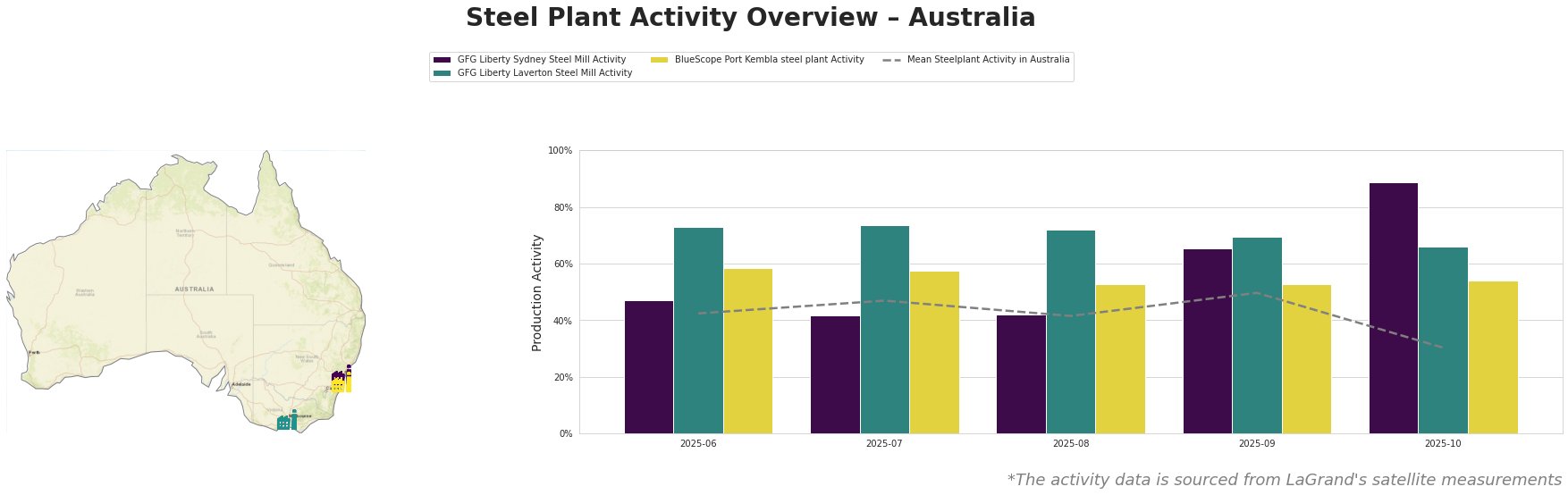 Australia’s steel market exhibits a very positive sentiment, driven by substantial investments in green steel production. This report analyzes observed activity changes at key steel plants, linking them to recent industry news focusing on Western Australia, where significant developments in low-carbon steelmaking are underway. “Rio Tinto invests $22 million in Calix low-carbon steel project,” “Fortescue advances green iron project using Metso’s hydrogen-based DRI and electric smelting furnace,” and “Rio Tinto invests A$35 million in Calix’s Zesty™ plant to advance low-carbon steelmaking” signal a long-term shift towards sustainable practices. No direct relationship between these specific project announcements and the observed short-term activity data could be established.