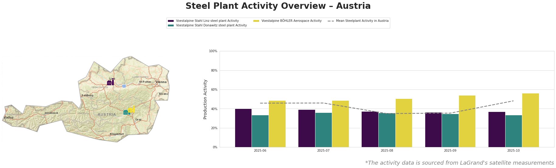 Voestalpine Stahl Linz, located in Upper Austria, is an integrated steel plant with a capacity of 6 million tonnes of crude steel produced via the BOF process. Its main products are hot-rolled, cold-rolled, and coated steel strips. Activity at the Linz plant remained relatively stable at around 36-40% during the observed period, with a slight dip from 40% in June to 37% in October. No direct link can be established between this activity and the Australian news articles.