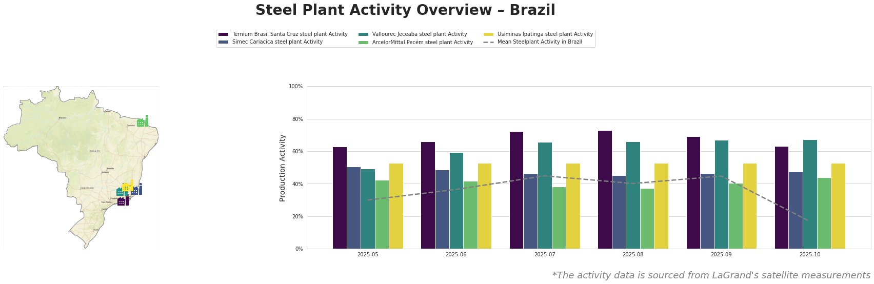 Bar chart and satellite map of steel production activity in Brazil