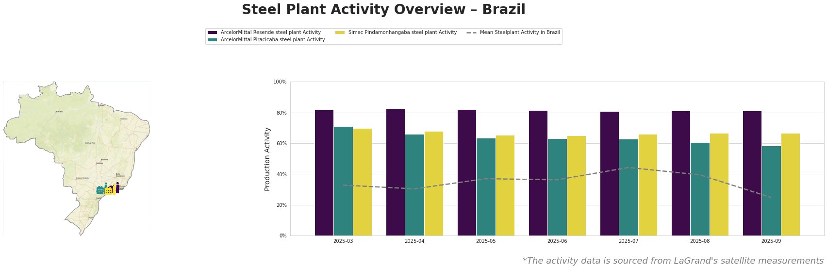 Brazil’s steel market faces headwinds from rising imports and declining investment, impacting domestic production. This report analyzes recent news and plant activity data to provide actionable insights for steel buyers and analysts. “Brazil broadens steel import quota coverage” and “Imports impact investment in Brazil’s steel industry” directly correlate with observed activity changes, while the “Wire rod exports from Brazil decline in August 2025” and “Exports of heavy plates from Brazil decline sharply in August 2025” cannot be directly linked to plant activity.