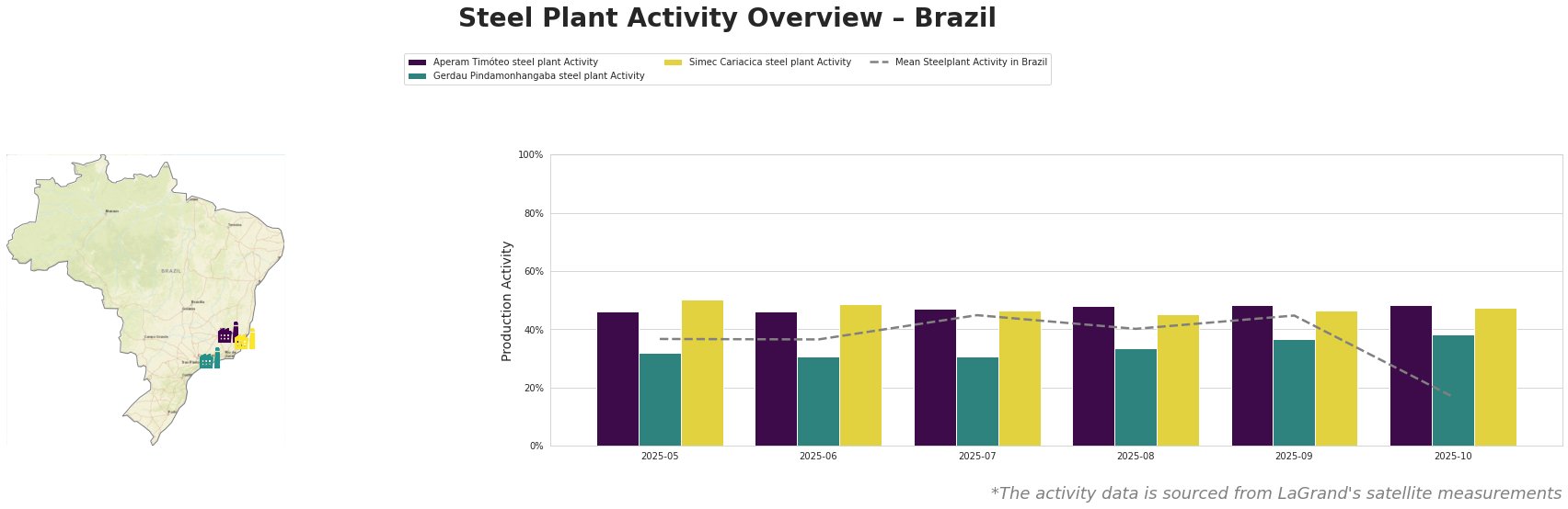 The consistent activity levels observed at the Aperam Timóteo, Gerdau Pindamonhangaba, and Simec Cariacica plants, especially in the face of increasing climate pressures surrounding COP30, suggest a stable near-term supply outlook for their respective product categories. However, the mean steelplant activity shows a significant drop in October.