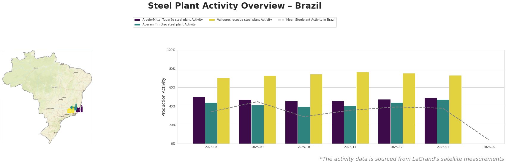 Bar chart and satellite map of steel production activity in Brazil