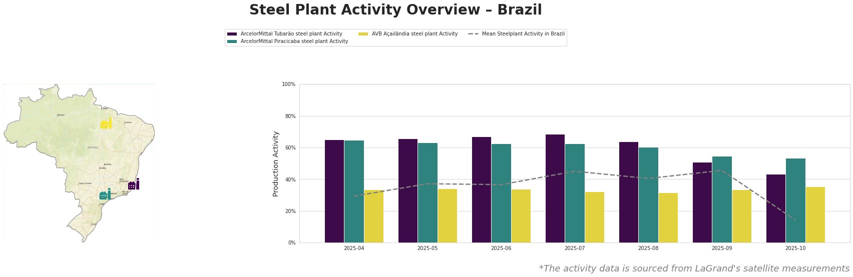Bar chart and satellite map of steel production activity in Brazil