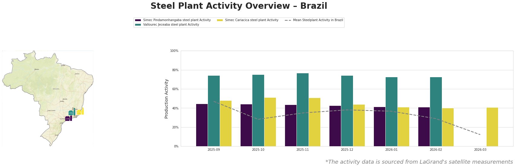 Across January to March 2026, activity levels at Brazil’s steel plants dropped sharply, with a significant decline noted in March, where the mean activity plummeted to 12%. The Simec Pindamonhangaba plant exhibited stability until this drop but maintained a comparatively low production level at 41% in February. The Vallourec Jeceaba plant showed a strong performance peaking at 77% in November but did not report activity data in March, indicating possible operational suspensions. In contrast, Simec Cariacica remained functional at 41% in March but could not offset the overall industry decline.