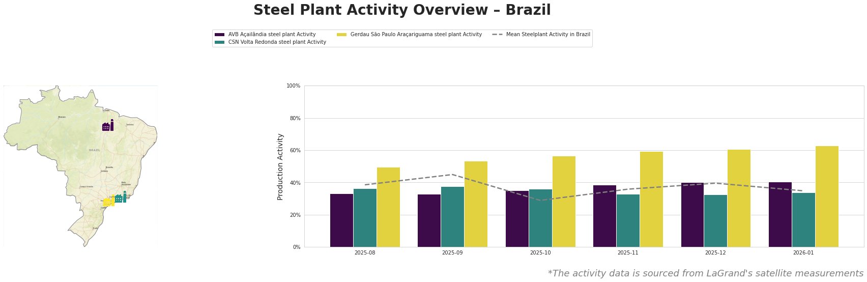 AVB Açailândia, employing integrated processes, has shown resilience with activity rising from 33% to 41% between December 2025 and January 2026. However, no direct correlation can be established with the recent market articles. Meanwhile, Gerdau São Paulo Araçariguama, which focuses on electric arc furnace (EAF) processes, also evident in its growth in activity from 57% to 63%, reflects the ongoing alignment with burgeoning steel exports as reported.