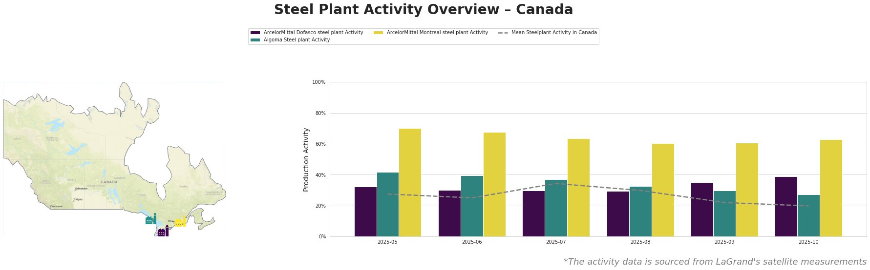 Located in Ontario, ArcelorMittal Dofasco operates as an integrated steel plant with a crude steel capacity of 4.05 million tonnes per annum (ttpa), utilizing both Basic Oxygen Furnace (BOF) and Electric Arc Furnace (EAF) technologies. It focuses on finished rolled products, serving the automotive, building, and energy sectors. The observed activity at ArcelorMittal Dofasco saw an increase from 35% in September to 39% in October. This rise in activity could not be directly linked to any of the provided news articles.