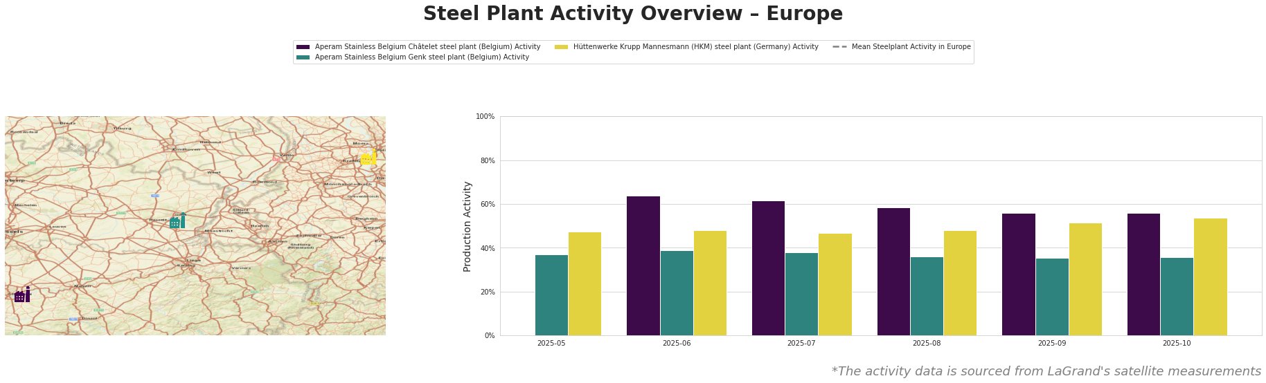 Aperam Stainless Belgium Genk steel plant, also an EAF-based stainless steel producer with a slightly larger capacity of 1.2 million tonnes, shows a steady activity level throughout the period. No direct connection between this stable activity level and the named news articles can be established.