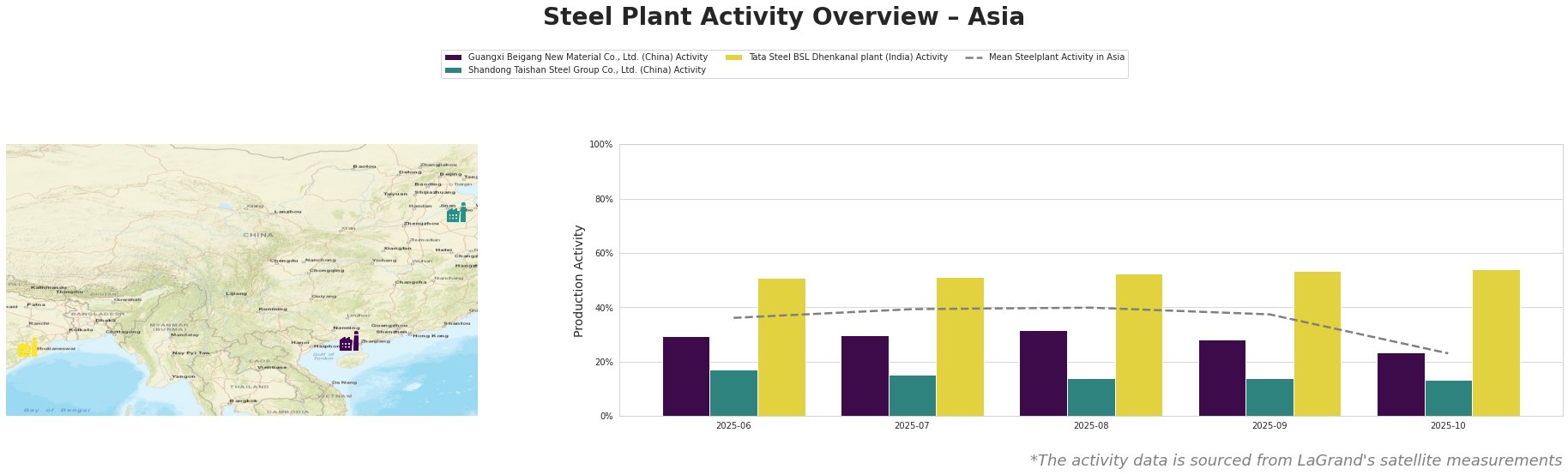 Guangxi Beigang New Material Co., Ltd., an integrated BF and EAF-based steel plant in Guangxi, China, with a 3.4 million tonne crude steel capacity is experiencing fluctuating activity levels. The plant’s activity dropped from 32% in August to 23% in October, mirroring the overall decline in Asian activity. Given their production of HRC and CRC, this might be partly attributable to weaker regional demand impacting HRC/CRC offers as referenced in “India-EU coil prices drop amid CBAM benchmark leaks“.