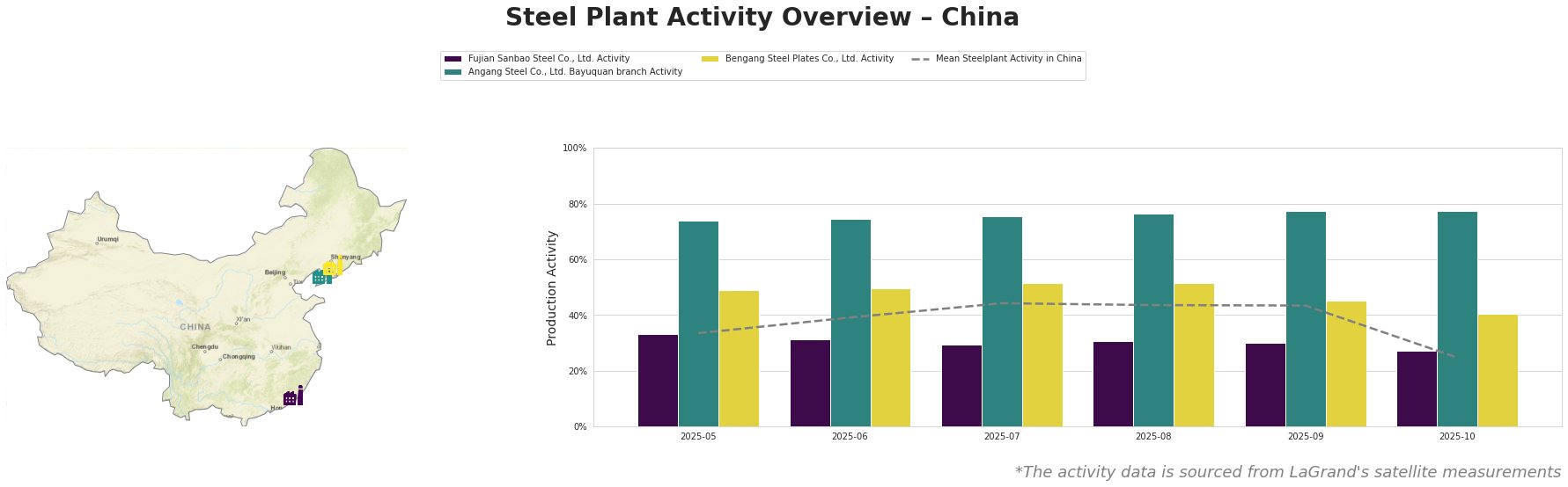 Fujian Sanbao Steel Co., Ltd., an integrated BF steel plant in Fujian province with a crude steel capacity of 4.62 million tonnes, primarily produces finished and semi-finished rolled products, including high-strength fasteners. Its observed activity decreased from 30% in September to 27% in October. No direct relationship between this activity decrease and the named news articles could be established.